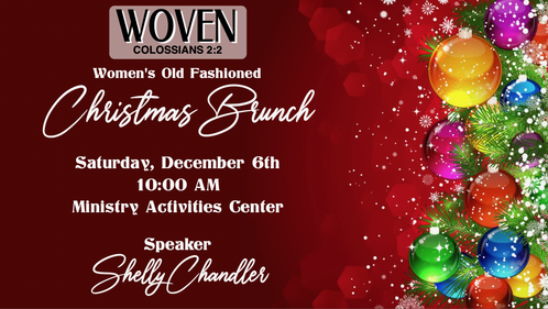 We are excited to host our annual Women’s Christmas Brunch. This year’s theme is “Old-Fashion Christmas.” Bring out the tinsel and garland. We invite each small group to decorate one table for judging in our annual table contest. Table decorating will be Friday from 9am-7pm. Table judging this year comes with a twist. We will have guest judges. All tables will be judged Friday evening. We also invite each small group to provide two breakfast casseroles. The Women’s Ministry will provide fruit, cinnamon rolls, juice and coffee. We hope you’ll come and hear our special guest speaker, Shelly Chandler. You are sure to be blessed. Door prizes, photo ops and special fellowship to kick off the holiday season. We hope to see you there.