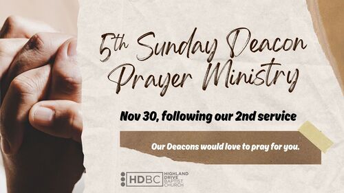 Our HDBC deacons serve the church and community in a number of ways. One of the most important things that these men do is to pray. They are willing to come alongside HDBC members anytime and pray for them. They have also set aside one Sunday each month (whenever a month has a 5th Sunday) to offer to pray for members and guests. Our deacons will be available in the library, which is located on the east side of the building just outside the worship center. If you would like for our deacons to pray for you, simply make your way to the library at the conclusion of our 10:45 worship service on November 30. You will be given an opportunity for our deacons to pray privately with you.