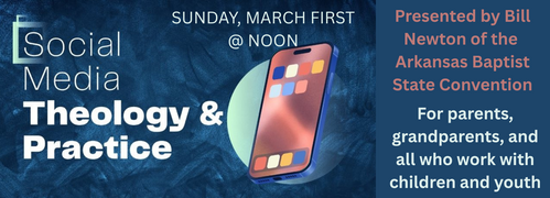 Bill Newton will be our guest on Sunday, March 1st. He will be preaching both services that morning and then leading a seminar following the second service. Bill serves as the Next Gen & Discipleship Strategist with the Arkansas Baptist State Convention and has worked with the next generation for many years in ministry. Bill will be leading a seminar following the morning worship that is open to all parents, grandparents, and volunteers who work with children and youth. We'll take a real look at the impact social media is having on kids and teens, how God's Word speaks into our online lives, and give some practical tools for navigating social media in the home. Lunch will be provided. This is free to attend, but we need everyone to register to plan for lunch. Please register by clicking the link below.